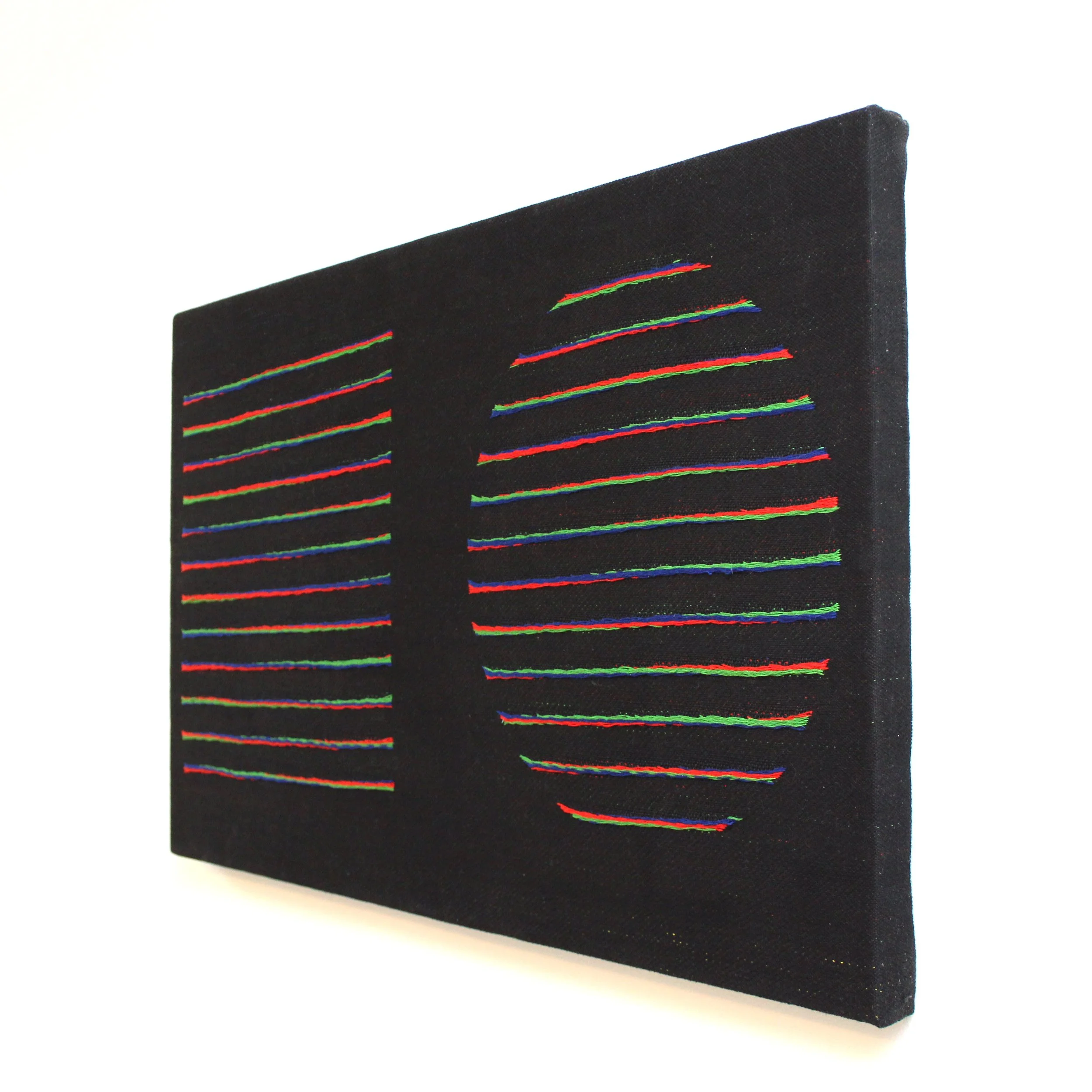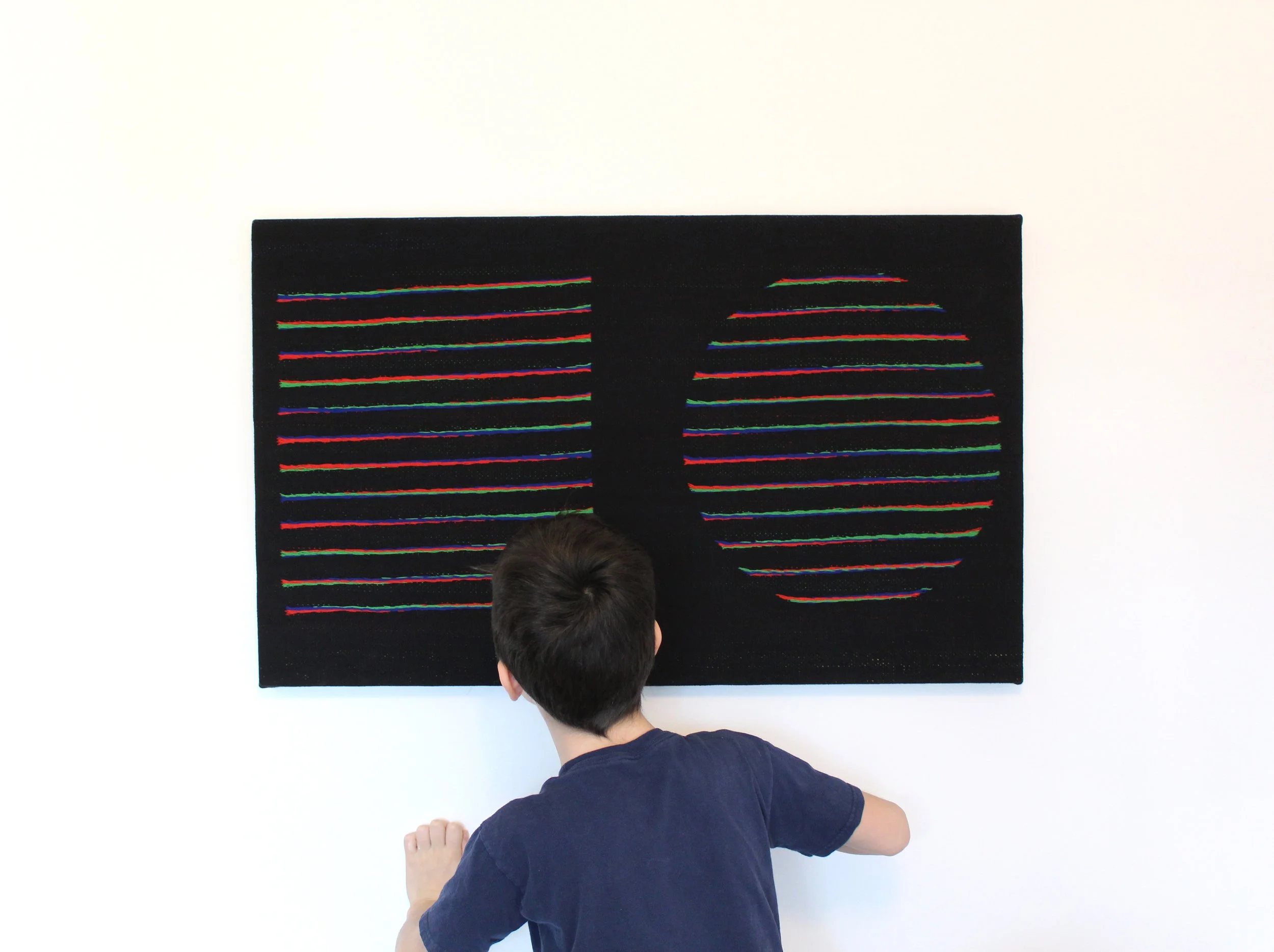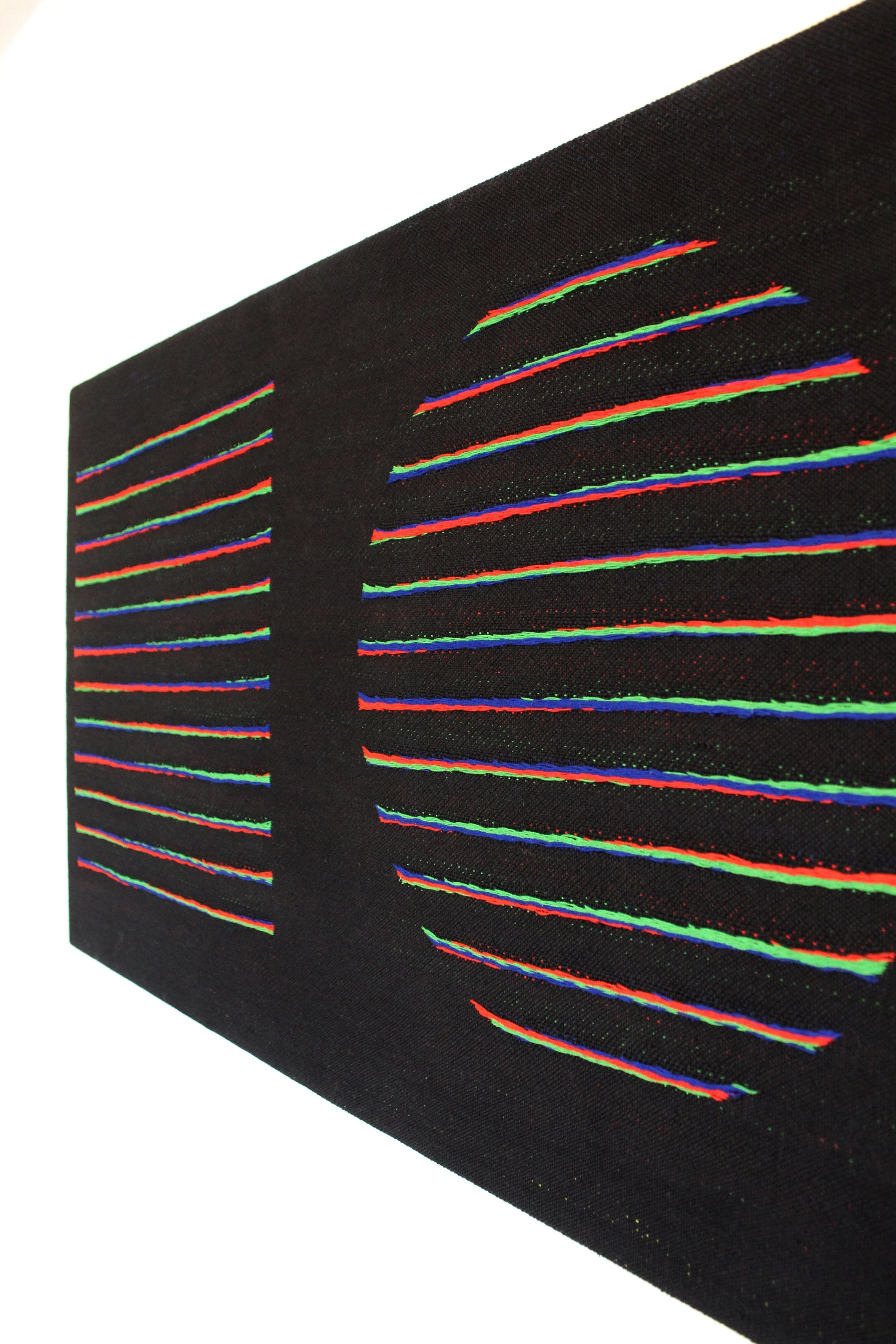 From a distance, the square and circle in this handwoven textile look like they are made from entire spectrum of colors, BUT, it is very regular stripes of blue, green and orange that are broken up by the black foreground which is at a slight tilt- breaking up the stripes causing your eye to blend the colors. The weave structure on the colorful stripes is very loose which makes these areas look like thick painterly brush strokes. Hand woven in early 2022 on a TC2 digital loom, cotton, 24”x40”